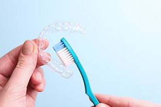 Fortunately, keeping your aligners clean is quick and easy. Simply rinse them with clean, cool water each time you take them off, and gently scrub them with a damp, soft-bristled toothbrush before putting them back on. You can also use a clear, mild dishwashing liquid, if needed, and soak them in a dentist-recommended cleaner each night to keep them odor-free. Just make sure not to use anything harsh, like mouthwash, regular toothpaste, or bleach.